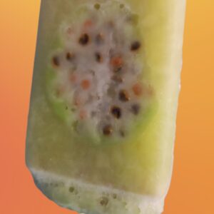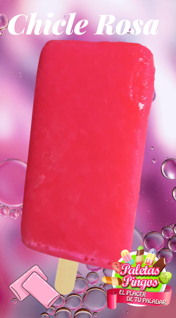 Paleta de agua con concentrado sabor chicle rosa con un toque de base de helado y pequeños chiclets